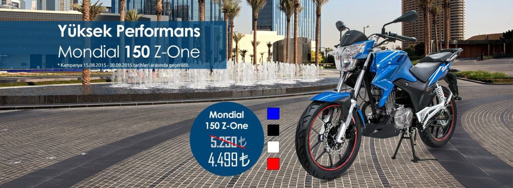 Mavi, Siyah, Beyaz ve Kırmızı 4 farklı renk seçeneği ile her zevke uygun yüksek performanslı Mondial150 Z-One’lara şimdi 4.499 TL’den sahip olabilirsiniz.